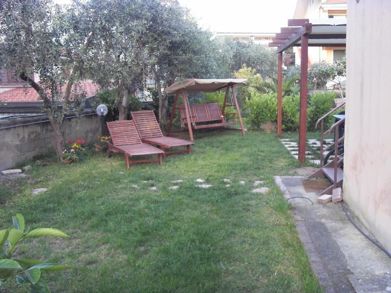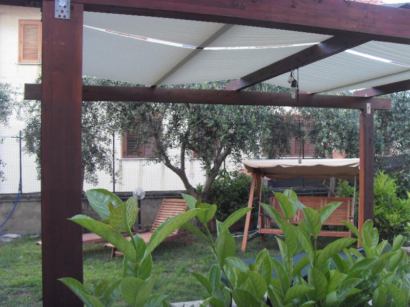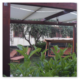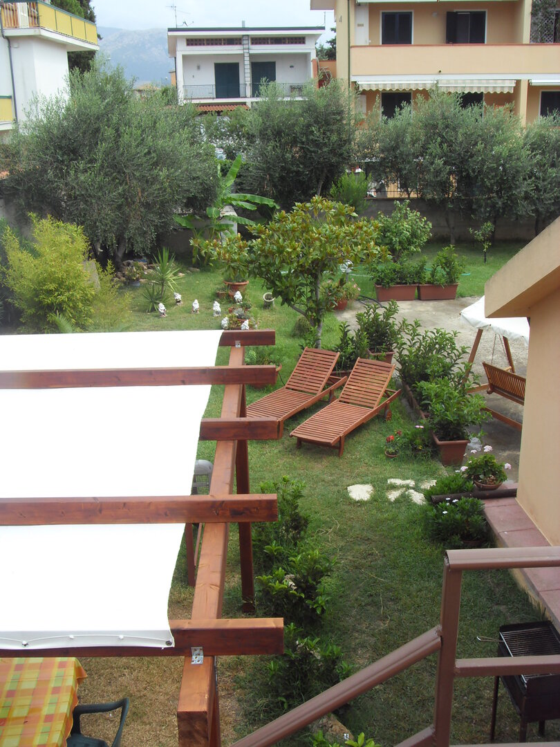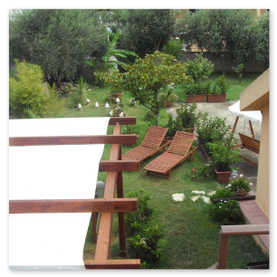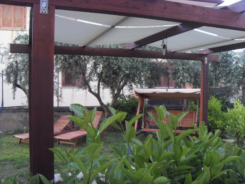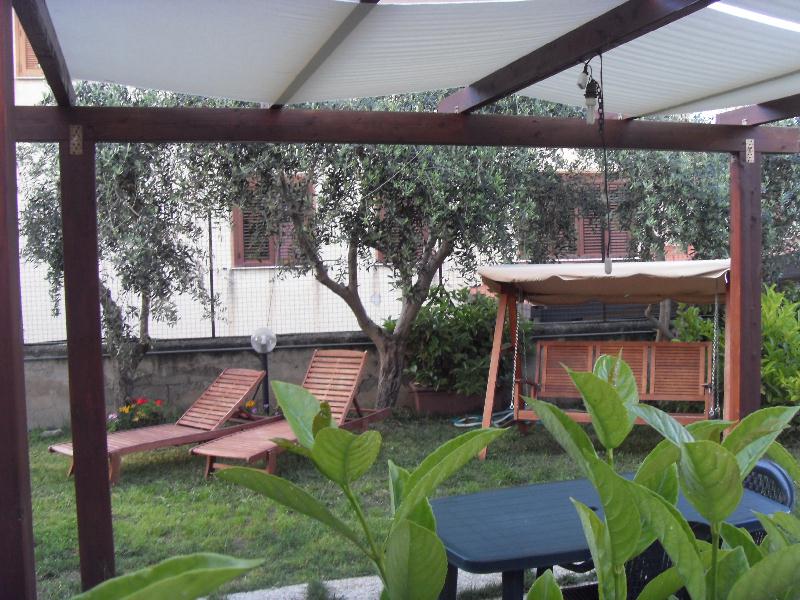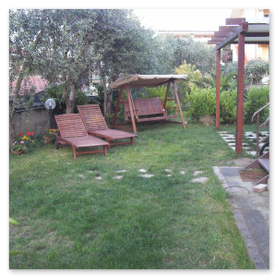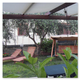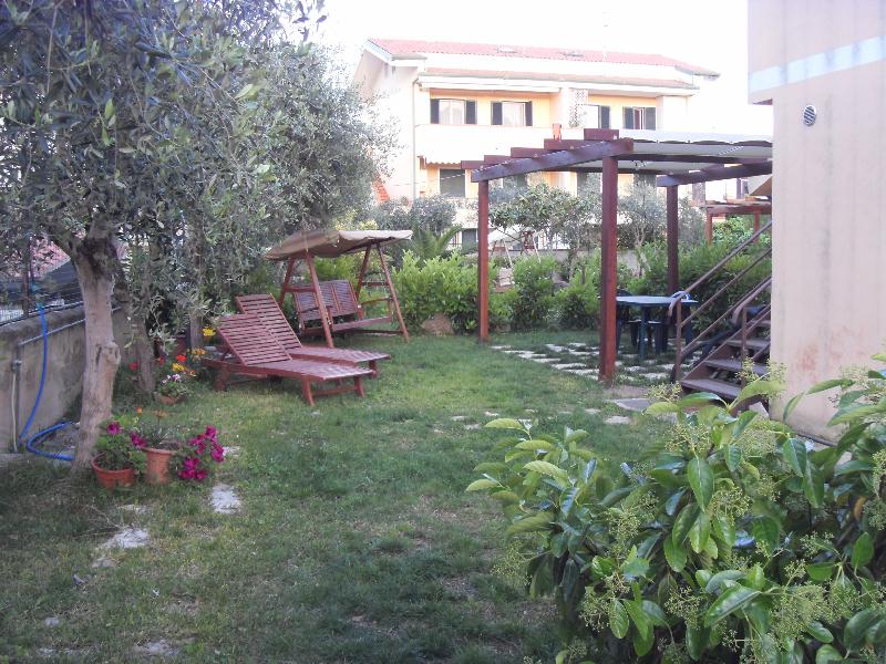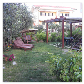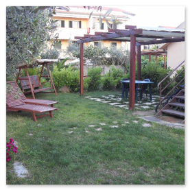 Posto al piano rialzato. L'appartamento Alba offre: posto auto interno nelle vicinanze dell’ingresso, doccia esterna, ampio giardino con gazebo coperto, fontanina e barbecue in muratura, dondolo, lettini prendisole tavolo e sedie. Dal giardino vi è una scala che conduce al terrazzo, attrezzato con tavolo sedie e banco da lavoro con lavello il tutto coperto da un pergolato in legno. L’ingresso da all’interno di un ampia cucina soggiorno, dalla quale si accede a due ampie camere da letto, e due Bagni di cui uno con vasca, biancheria da letto e da bagno, tutti gli ambienti sono molto ariosi e luminosi, questa abitazione è ideale per una famiglia composta da 6 elementi. Il giardino resta illuminato tutta la notte, la disinfestazione contro insetti volatili e striscianti viene effettuata sistematicamente.